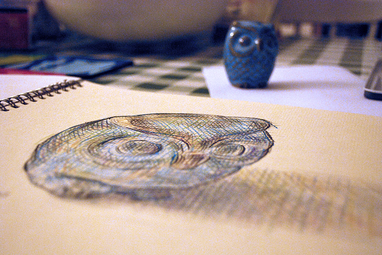 After a mentally exhausting day working on an Open University assignment, producing a sketch this evening was harder work than it might otherwise have been. It’s a coloured pencil drawing on 9″ x 12″ pastel paper. The subject is a small owl ornament.