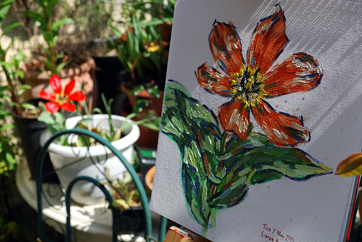 Today’s sketch was painted in Winsor and Newton alkyd (fast drying oil colour) paints on Crawford & Black 12″ x 10″ canvas. Its’ subject is a tulip, the bulb of which my mum bought at Floriade 2012. This Dutch tulip now seems to be enjoying the British Spring of 2013.