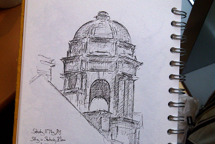 This is a drawing in pen on paper from a trip to Birmingham earlier today. It’s the top of a classical-style building as seen from a Starbucks near Birmingham Museum & Art Gallery. I’m afraid I’ve no idea what the building was.