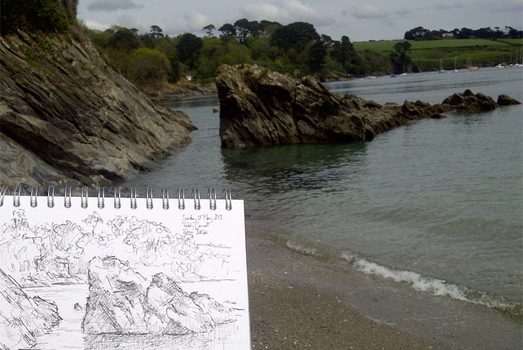 This is another drawing from my trip to Cornwall last month. It’s a sketch in pen on paper. Depicted is the coastline of the Helford River, as seen from the beach at Trebah Garden. The view looks down river, towards Mawnan.