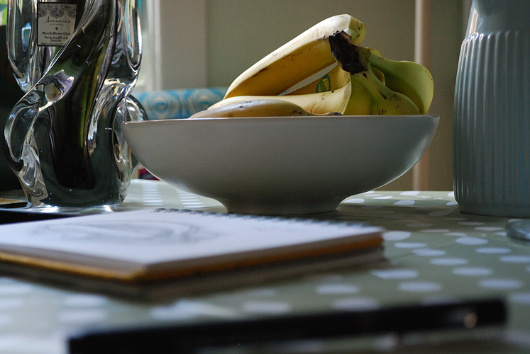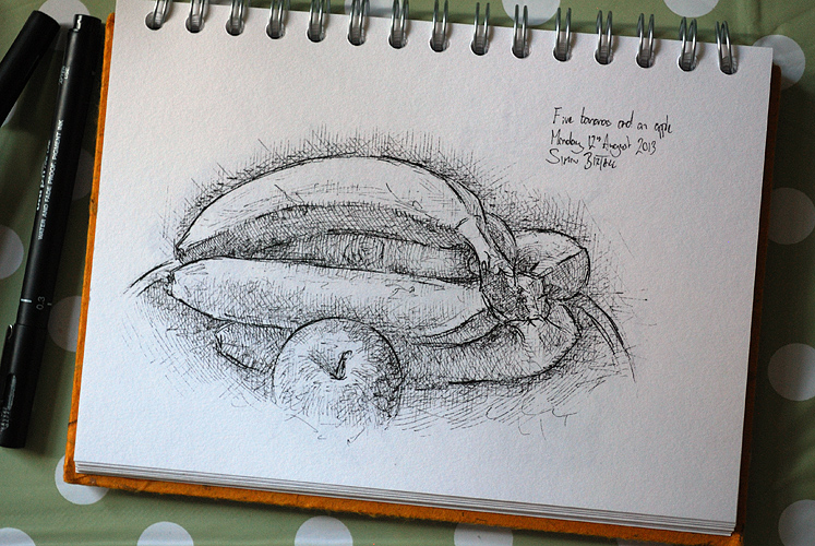 At a bit of a loose end this afternoon – staring at a computer with lots to do but feeling distinctly indecisive – I thought my time might be better spent with a sketchpad and some pens. I challenged myself to do a quick sketch of the first thing that caught my eye (within reason). Happily this turned out to be a bunch of bananas and an apple in their fruit bowl home. I sketched them in Uni Pin fine line pens on A5ish paper. I find drawing very therapeutic – it always makes me feel better. Indecision cured!