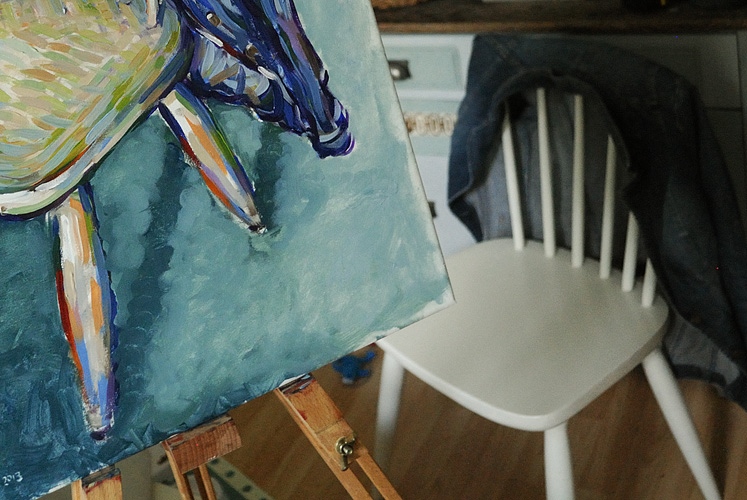 The painting depicts a denim jacket hanging on the back of a wooden chair. It was painted in Winsor & Newton alkyd paints on 16″ x 12″ Daler canvas.