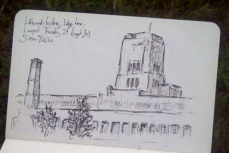 Whenever I pass the Littlewoods building on Edge Lane in Liverpool I’m struck by its’ faded beauty and art deco echoes. I’ve thought for years it would make a great modern art gallery, in the spirit of Tate Modern. I’ve just read that it’s going to be made into a hotel and business complex with offices and shops. I’m assuming that it will receive a thorough tarting up for that, and whilst I’m glad that the building will be looked after, I will miss the romance in its’ crumbling appearance – its’ chipped, dirty paintwork and the stray vegetation growing from within its’ walls. I made this quick sketch this morning in Uni Pin pens on A6 paper.
