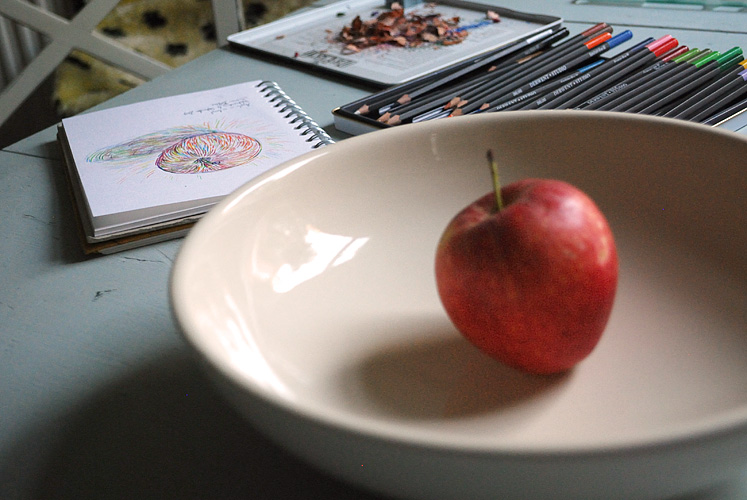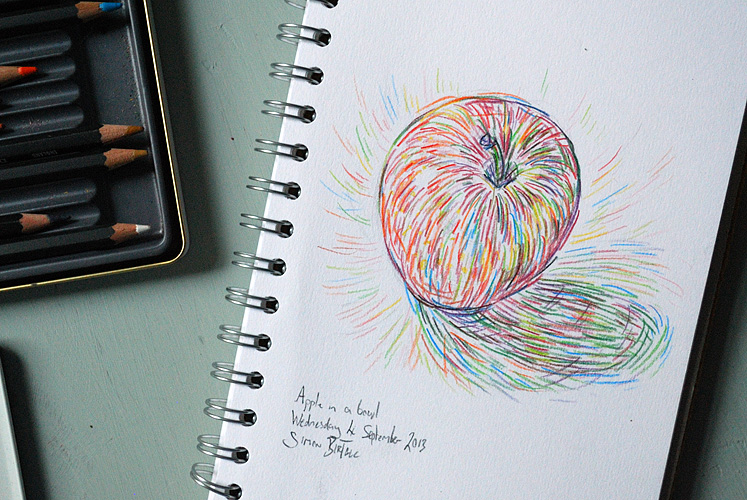 A drawing in coloured pencil in an A5 sketchpad, drawn late yesterday afternoon. I was trying to approach this coloured pencil drawing in the same way that I might approach a painting – building up relatively pure colour in layers of small marks.
