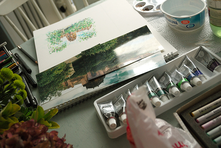 The artwork is rendered in mixed media on Daler Rowney watercolour paper. I started of with an outline pencil drawing, before adding some colour in gouache. I then added a little coloured pencil, some black pen outlines and squiggles, some further greyscale pencil touches and finally a bit of pastel. There was just about enough room on the dining room table for all the media. The image size is around 14cm square.