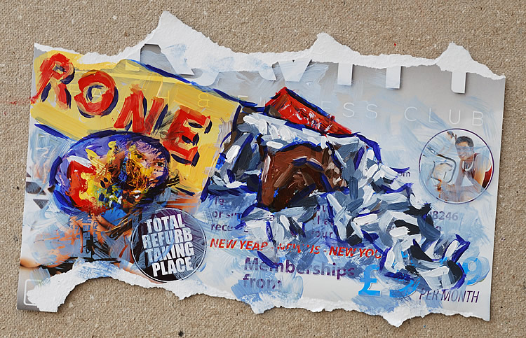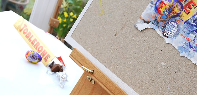 Painted rapidly in acrylics in around an hour or so, this sketch depicts an opened bar of Toblerone and a Cadbury’s Cream Egg (unopened here, but opened very shortly afterwards). I’ve tried to allow elements of the flier to show through to demonstrate either opposing lifestyle choices or the two sides of a healthy-balanced lifestyle, depending on how you see it.