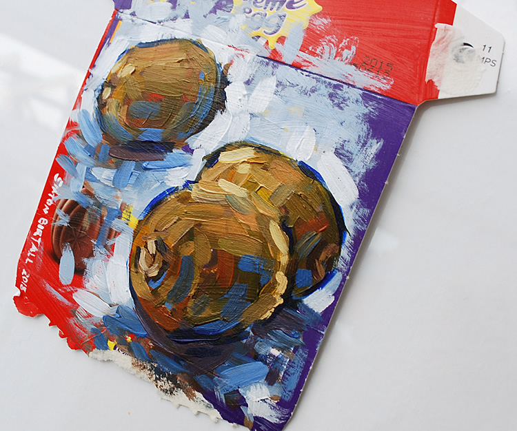The resulting painting was made in acrylics on Cadbury’s Cream Egg packaging, which I had prepared with a clear gesso ground. It took around 50 minutes to complete.