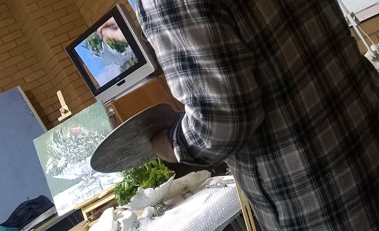 Working within set time limits I sought to create something of an Impressionistic interpretation of the subject matter. The painting was produced over around an hour and a quarter either side of a tea-break. It depicts a still life arrangement of ranunculus, hyacinth and moss in a decorative bowl and was painted on 20” x 16” canvas board. Also pictured in some of these photographs is an earlier attempt at the same still life (on a green background).