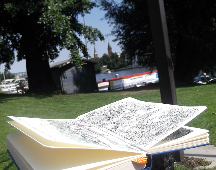 So… I thought it might be nice to post a drawing made on an idyllic mid-summer day. Warm memories of my wife and I lazing on the banks of the Dahme at the Best Western Hotel am Schloss Köpenick in Berlin, just a couple of months ago. This unhurried sketch was made in Uni Pin fine line pens and coloured pencil over a double-page spread of a 14 x 9 cm pocket sketchbook.