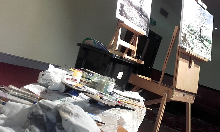 Asked to demonstrate painting in acrylics, I thought a winter landscape might be a pertinent choice of subject matter for an early February event. The subject matter was agreed upon several months ago, little thinking that our winter would be quite so mild and snow-free. The reference photograph from which I worked was taken on a holiday to Appleby in Westmorland a year previously. It depicts a countryside landscape of receding snow dominated by a lone foreground tree rooted in rolling farmland, with the Pennine hills rising in the distance.